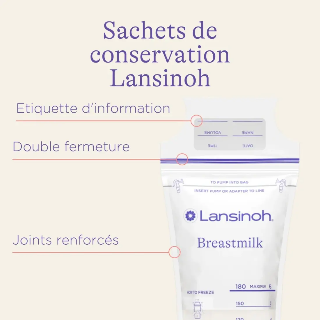 Sachets avec une double jonction hermétique sur les côtés. Dotés d’une petite étiquette pratique pour noter les dates d’extraction du lait maternel.