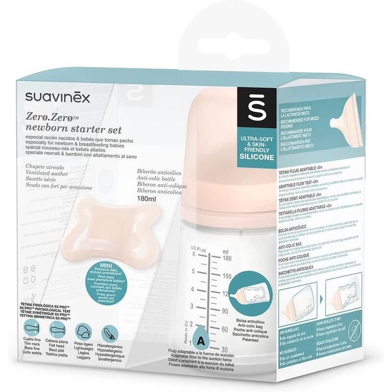 Le coffret ZERO.ZERO est constitué d’un biberon ZERO.ZERO 180 ml au débit adaptable (spécial allaitement) et d’une sucette physiologique de taille -2/2 mois. Biberon et sucette ZERO.ZERO s’utilisent en tandem, respectant l’allaitement.