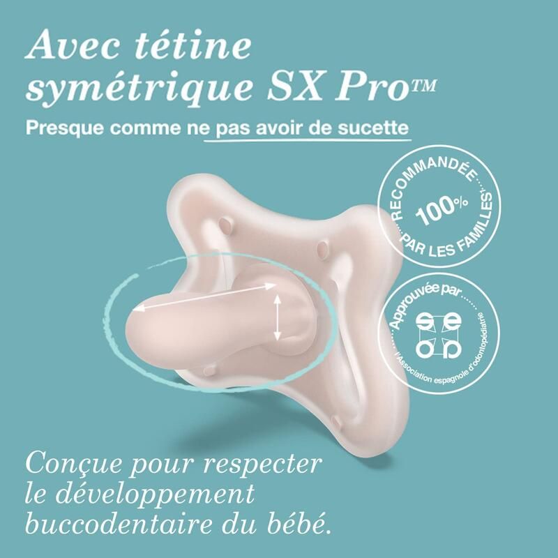 - Sucette avec tétine plate et symétrique : respecte le développement bucco-dentaire de bébé