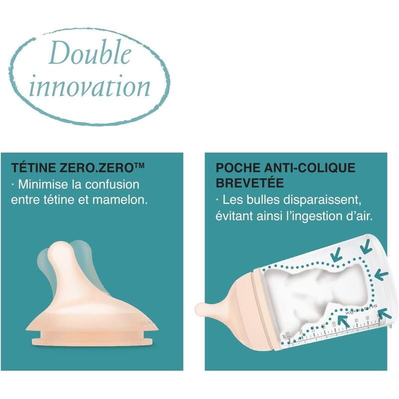 Le coffret ZERO.ZERO est constitué d’un biberon ZERO.ZERO 180 ml au débit adaptable (spécial allaitement) et d’une sucette physiologique de taille -2/2 mois.